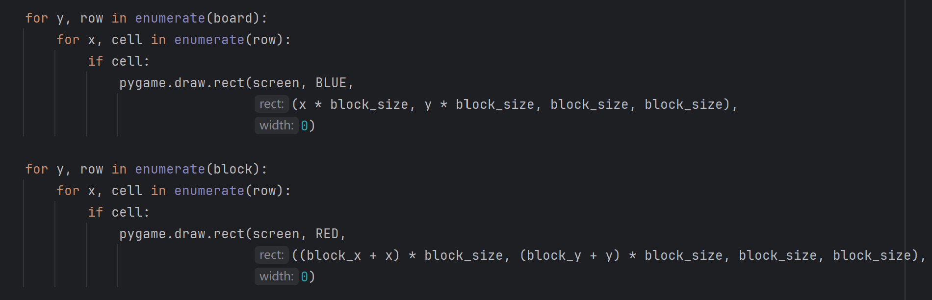 再遍历当前方块block,如果方块格子的值不为0,就用红色绘制一个矩形表示该方块格子在屏幕上的位置,位置根据方块当前坐标block_x和block_y计算。