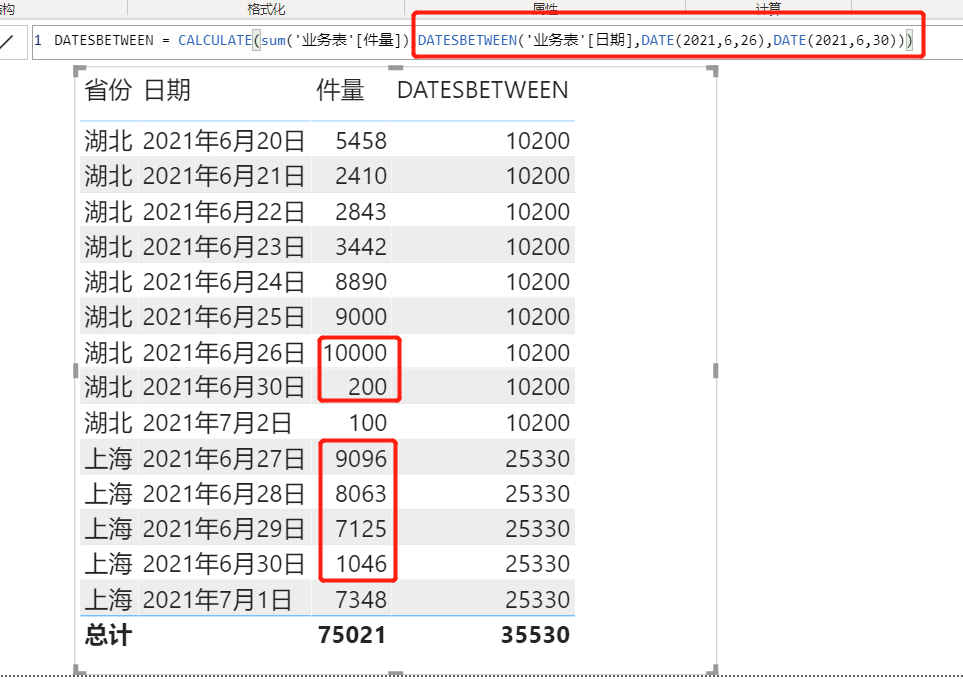DATESBETWEEN = CALCULATE(sum('业务表'[件量]),DATESBETWEEN('业务表'[日期],DATE(2021,6,26),DATE(2021,6,30)))