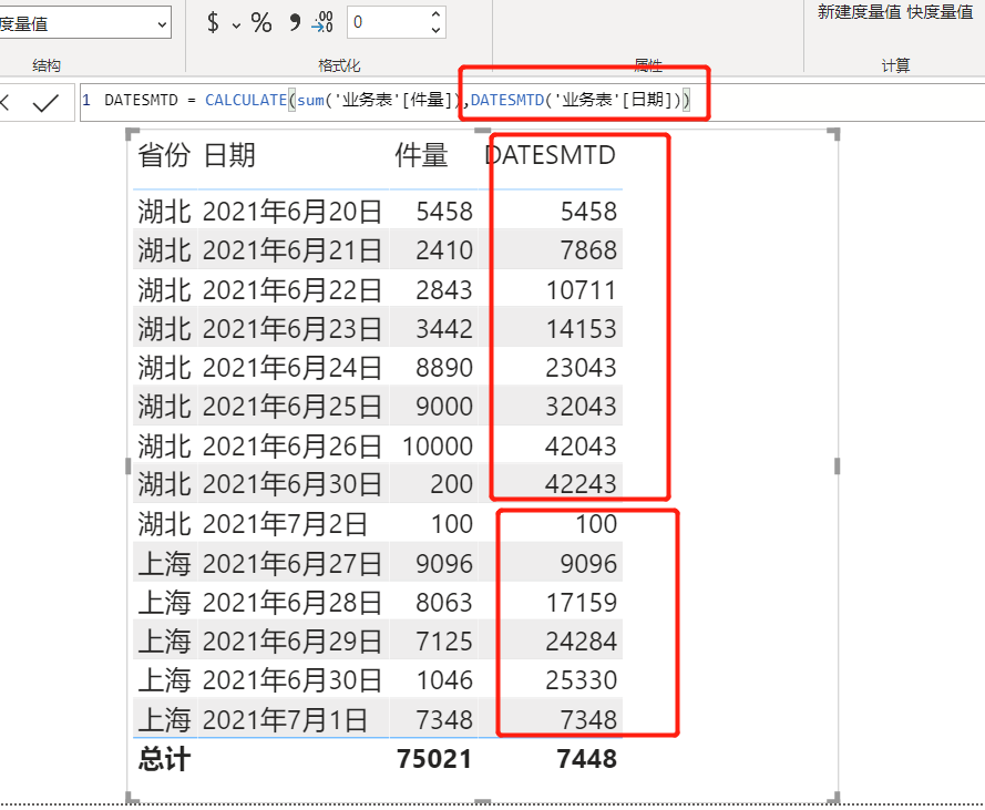 DATESMTD = CALCULATE(sum('业务表'[件量]),DATESMTD('业务表'[日期]))