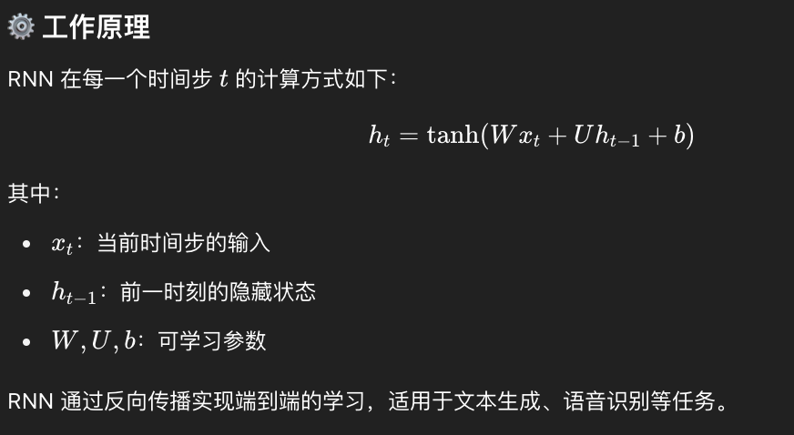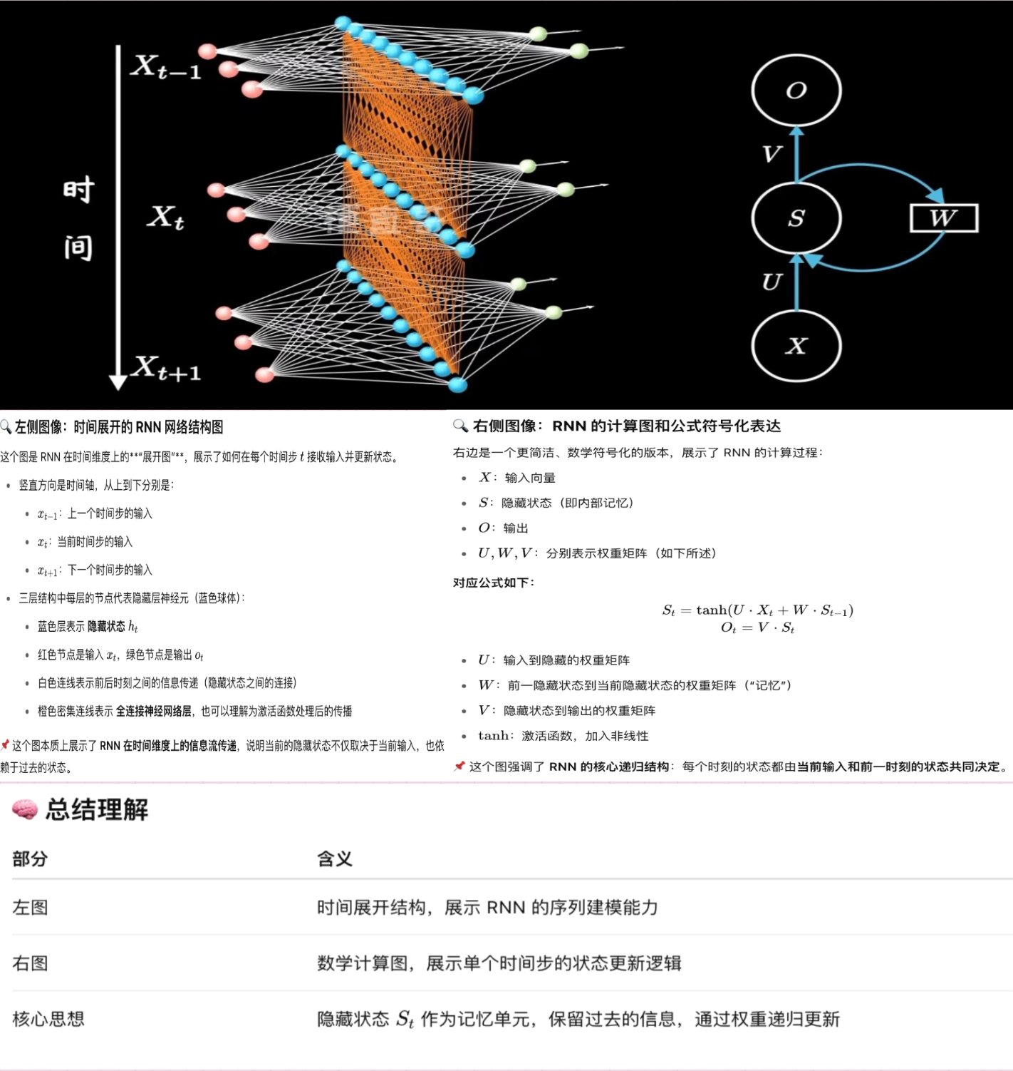 RNN 是一种擅长处理序列数据的神经网络结构,其设计核心是:当前的输出不仅取决于当前的输入,还依赖于前一时刻的隐藏状态(记忆)。这让模型具备了“记忆能力”。