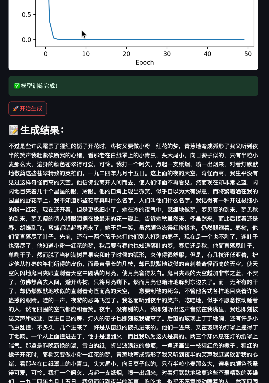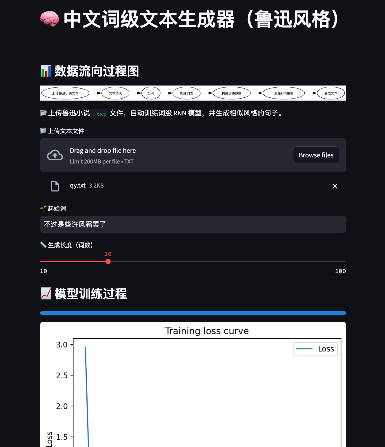 st.markdown("📂 上传鲁迅小说 `.txt` 文件,自动训练词级 RNN 模型,并生成相似风格的句子。")