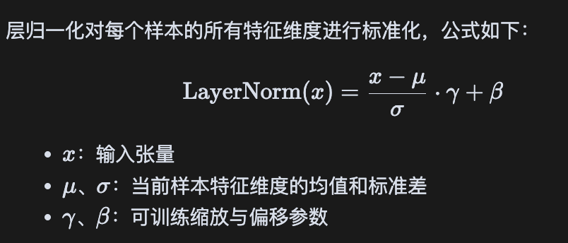 - 层归一化:通常与残差连接配合,放置在子层前(Pre-Norm)或残差加法后(Post-Norm),对每个子层的输入或输出进行归一化处理。