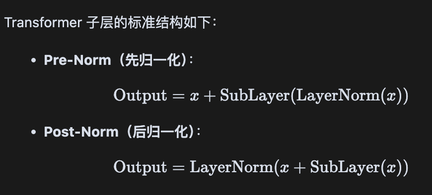 | Pre-Norm | 子层前 | 梯度路径清晰,训练更稳定,适合深层网络 |
