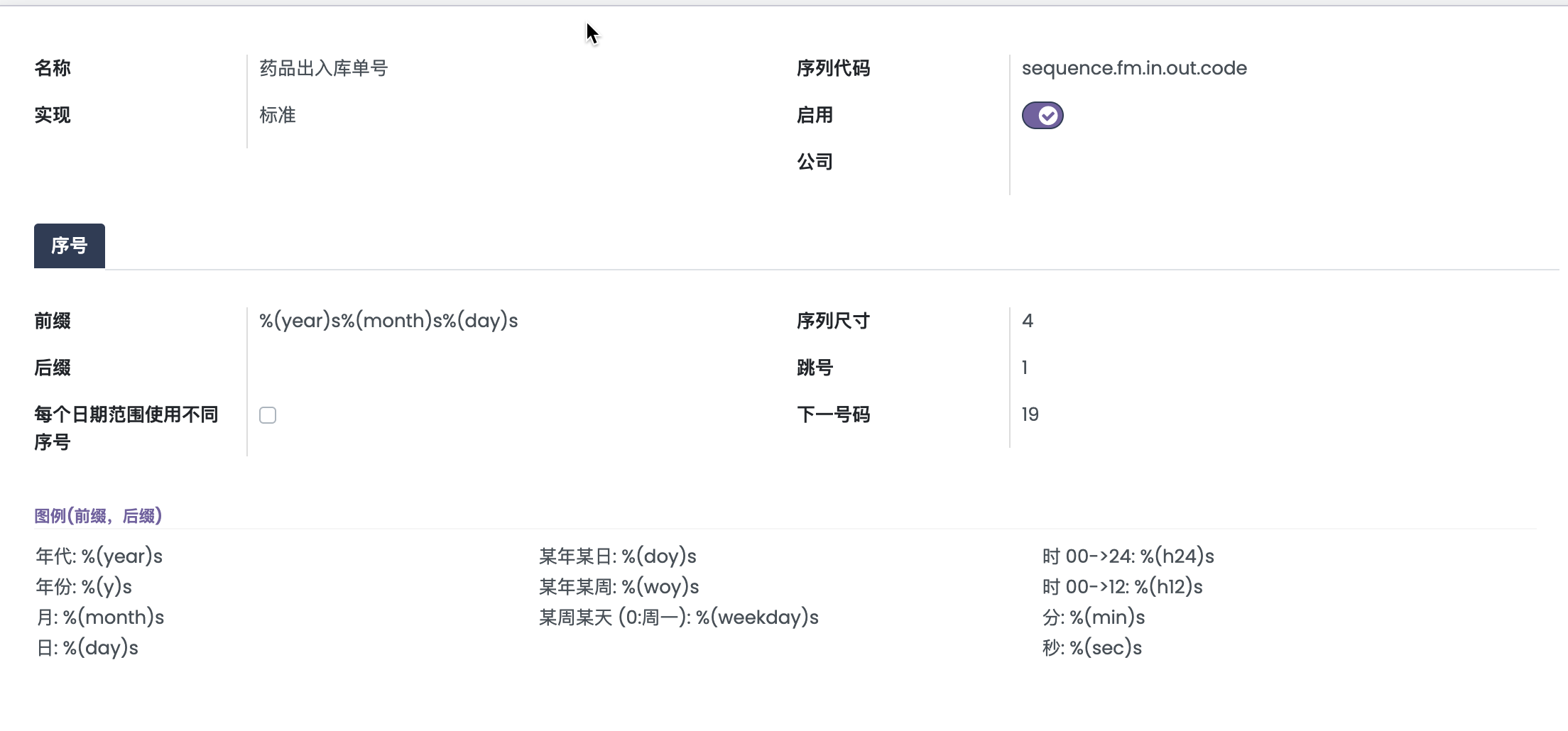 Odoo 序号系统支持在前缀和后缀中使用动态占位符,通过字符串插值实现:
