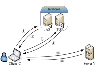 (这里的client c是指快递员,server v是取件人,AS是认证服务器,TGS是票据授予服务器)