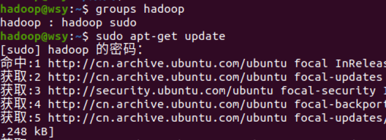 sudo adduser hadoop sudo 给hadoop用户增加管理员权限