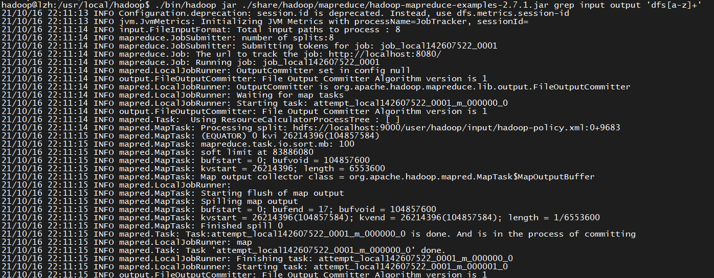 7../bin/hadoop jar ./share/hadoop/mapreduce/hadoop-mapreduce-examples-2.7.1.jar grep input output 'dfs[a-z]+'