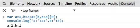 我们都知道交换两个变量值的常规做法,那就是声明一个中间变量来暂存。但鲜有人去挑战不声明中间变量的情况,下面的代码给出了这种实现。蛮有创意 的。