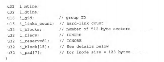 i_size字段表示文件大小(以字节为单位)。各时间字段表示自1970年1月1日0时0分0秒以来经过的秒数。所以,每个时间字段都是一个非常大的无符号整