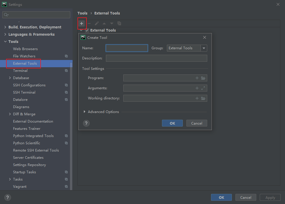 以上模块都安完,设置扩展工具的参数找到setting->tools->external tools,点击加号新建工具