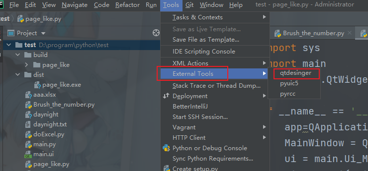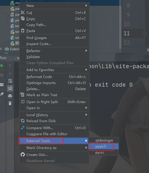 2、右键保存好的ui文件,选择external tools->pyuic5生成代码