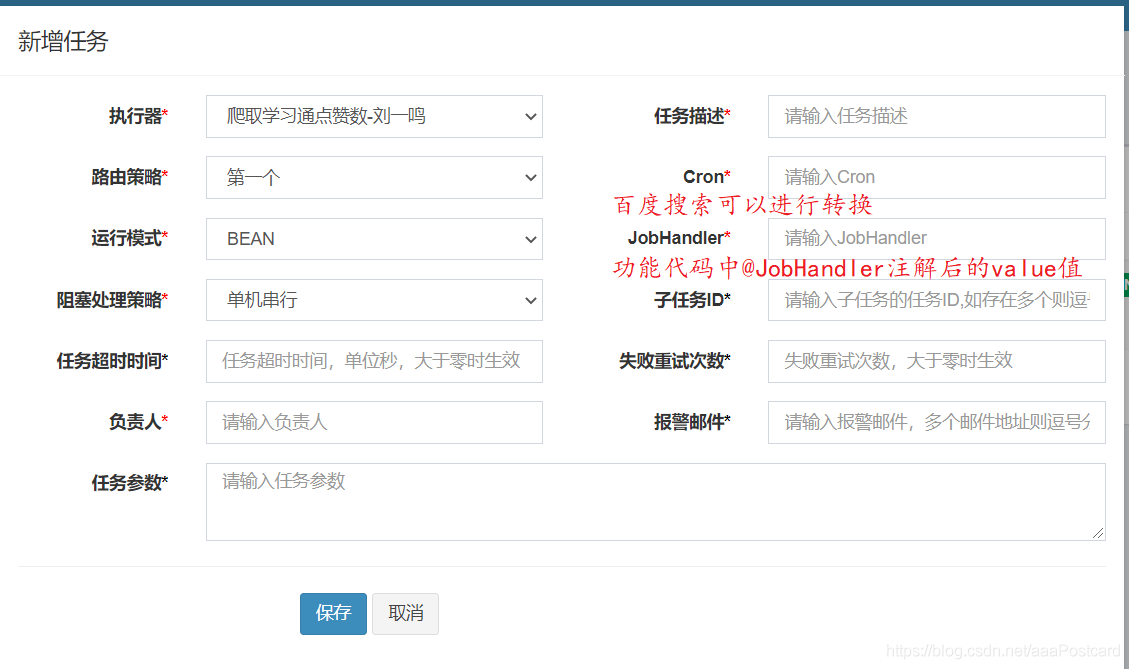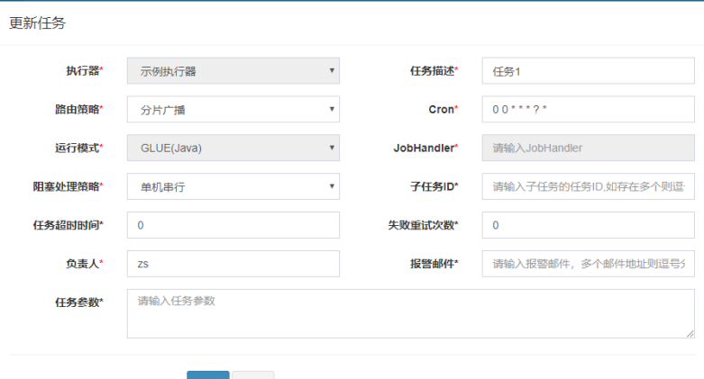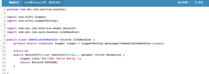 - 任务以源码方式维护在调度中心,支持通过Web IDE在线更新,实时编译和生效,因此不需要指定JobHandler。