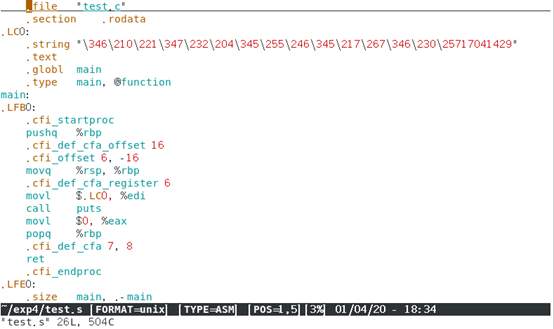 也可以用vim打开test.s文件来查看内容,也可以用其他命令,如cat