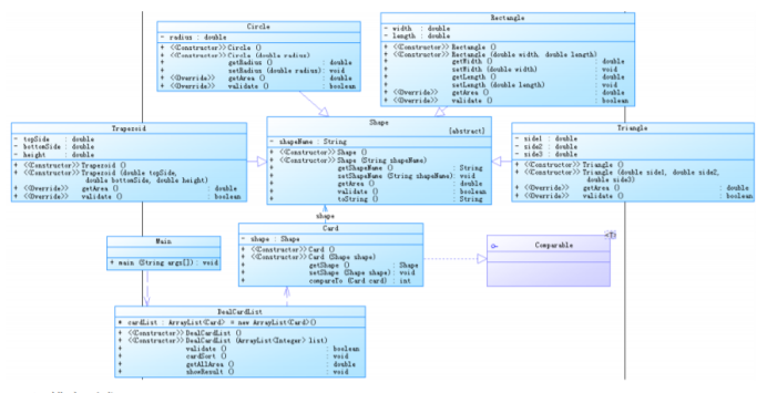 (7-2)本题根据( 7-1),主要对卡片(Card)进行分组游戏,规则为随机发放一些卡片给学生, 卡片仍然分为四种形状:圆形(Circle)、矩形(Rectangle)、三角形(Triangle)及梯形(Trapezoid), 并给出各种卡片的相应参数,首先我们要根据卡片类型将所有卡片进行分组(一个类型分为一组, 所以最多四组),然后能够对每组内的卡片根据面积值从大到小进行排序,同时求出该组内所有卡片 的面积之和,最后只需再求出每组卡片面积之和中的最大值即可。 还有一点,Comparable、Comparator 接口的应用 、图形类设计我参考了作业 7-1 的类层次结构,但我们需要进一步进行完善总结。因为本次作业要求对卡片排序时使用 Comparable 接口或 Comparator 接口。所以对程序功能的需求以及实现功能 、 对各图形信息进行输入并输出、入数据的正确性校验、对输入的图形按照图形类型进行分组都要进行全面的完善。类图同上,在这里不过多介绍。