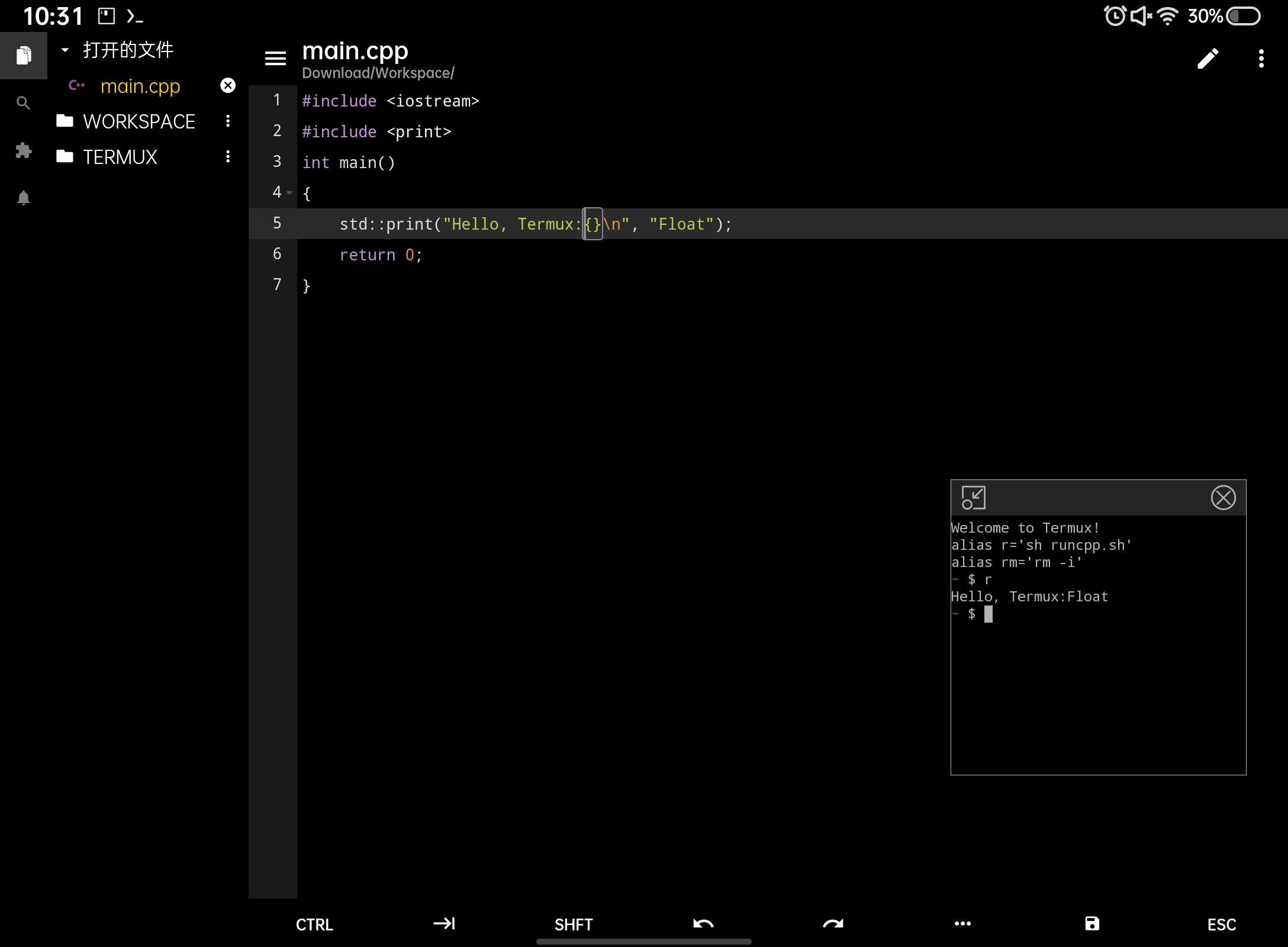 每次都要输入r才能运行依然很麻烦,好在Termux可以自定义按键,使用这样的按键配置可以实现一键运行:{macro: "r\n", display: 运行main.cpp}