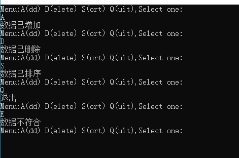 #include <iostream> using namespace std; int main() {char a; while(true) {cout<<"Menu:A(dd) D(elete) S(ort) Q(uit),Select one:"<< endl; cin>>a; if(a=='A') {cout<<"数据已增加"<<endl ;continue ;} else if(a=='D') {cout<<"数据已删除"<<endl;continue;} else if(a=='S') {cout<<"数据已排序"<<endl;continue;} else if(a=='Q') {cout<<"退出"<<endl;continue;} else {cout<<"数据不符合"<<endl;continue;} } return 0; }