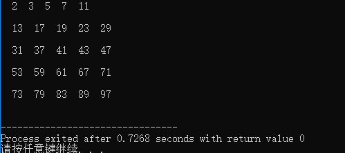 #include <iostream> #include <cmath> using namespace std; int main() { int i=2,n,f,z=0; do {f=1; for(n=2;n<=sqrt(i);n++) if(i%n==0) {f=0; break; } if(f==1) {cout<<" "<<i; z++; if(z%5==0) cout<<"\n"<<endl; } i++; }while(i<=100); }