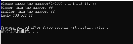 #include <iostream> using namespace std; int main() { int n=87,m; cout<<"please guess the nunmber(1-100) and input it: ";cin>>m; while(n!=m) {if(m<n) {cout<<"bigger than the number: ";cin>>m;} else {cout<<"smaller than the number: ";cin>>m;} } cout<<"Lucky!YOU GOT IT"<<endl; return 0; }