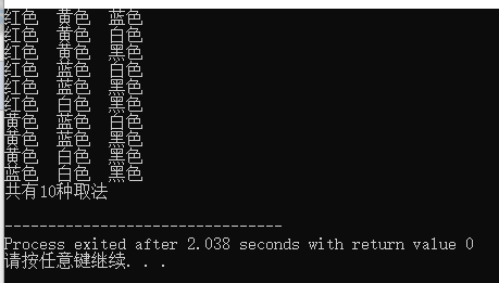 #include <iostream> using namespace std; void color(int x) {switch(x) { case 1:cout<<"红色 ";break; case 2:cout<<"黄色 ";break; case 3:cout<<"蓝色 ";break; case 4:cout<<"白色 ";break; case 5:cout<<"黑色 ";break; } } int main() {int i,j,k,x1,x2,x3,sum=0; for(i=1;i<=5;i++) {x1=i; for(j=i+1;j<=5;j++) {x2=j; for(k=j+1;k<=5;k++) { x3=k; sum++; color(x1),color(x2),color(x3); cout<<endl; } } } cout<<"共有"<<sum++<<"种取法"<<endl; }