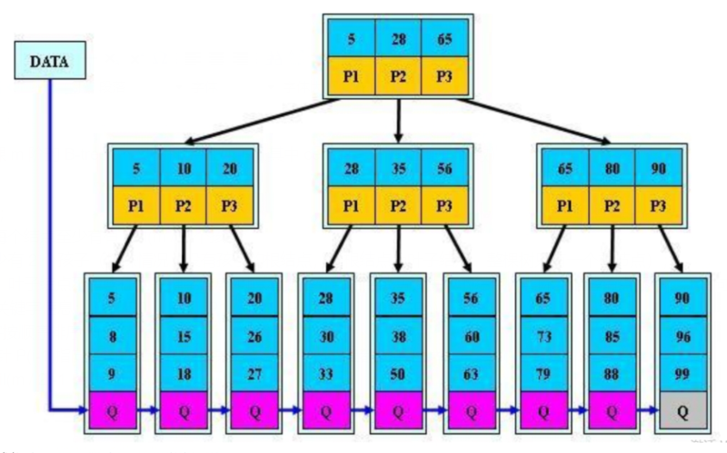 2.所有的叶子结点中包含了全部关键字的信息,及指向含有这些关键字记录的指针,且叶子结点本身依关键字的大小自小而大的顺序链接。 (B-tree 的叶子节点并没有包括全部需