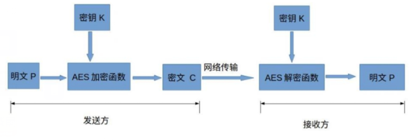 高级加密标准(AES,Advanced Encryption Standard)为最常见的对称加密算法(微信小程序加密传输就是用这个加密算法的)。对称加密算法也就是加密和解密用相同的密钥,具体的加密流程如下图: