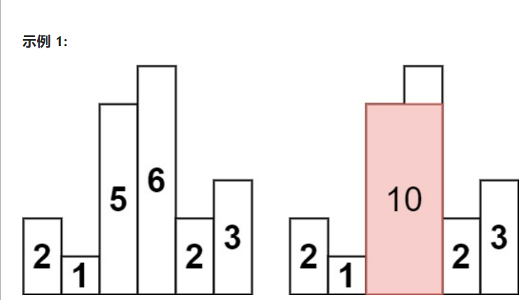 输入:heights = [2,1,5,6,2,3] 输出:10 解释:最大的矩形为图中红色区域,面积为 10