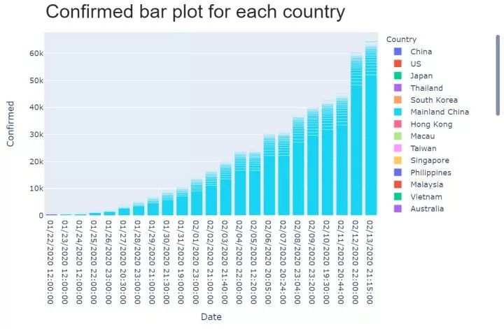 - fig = px.bar(df, x='Date', y='Confirmed', hover_data=['Province/State', 'Deaths', 'Recovered'], color='Country')