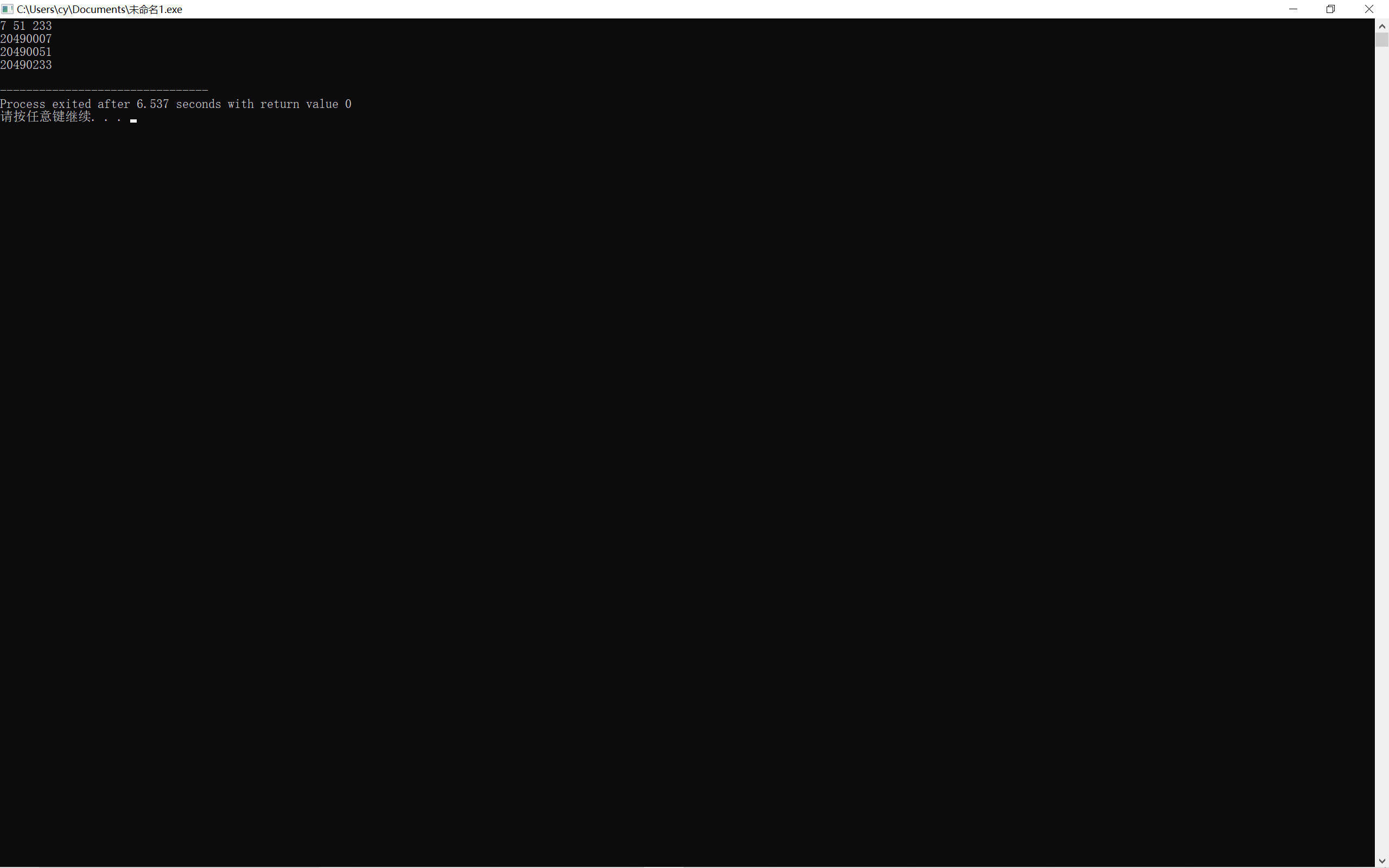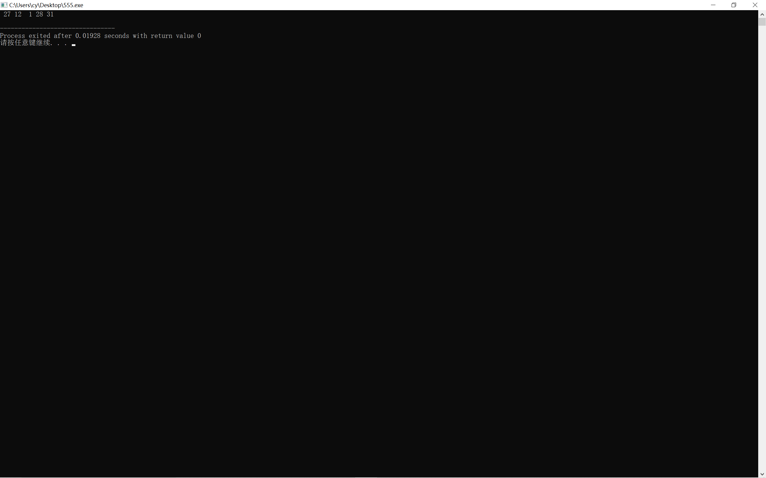 #include<stdio.h> #include<stdlib.h> #include<time.h> int main() { int x,a,j=3; srand(time(0)); x=rand()%31+1; printf("猜猜2021年12月哪一天会是你的luck day\n" "开始喽,你有三次机会,猜吧(1~31):"); while(j--) { scanf("%d",&a); if(a==x) { printf("你猜中了!\n"); break; } else if(a>x) printf("你猜的日期晚了,luck day悄悄溜到前面啦\n"); else printf("你猜的日期早了,luck day悄悄溜到后面啦\n"); if(j>0) printf("再猜(1~31):"); } if(a!=x) printf("次数用完啦,偷偷告诉你:12月你的luck day是%d号",x); return 0; }
