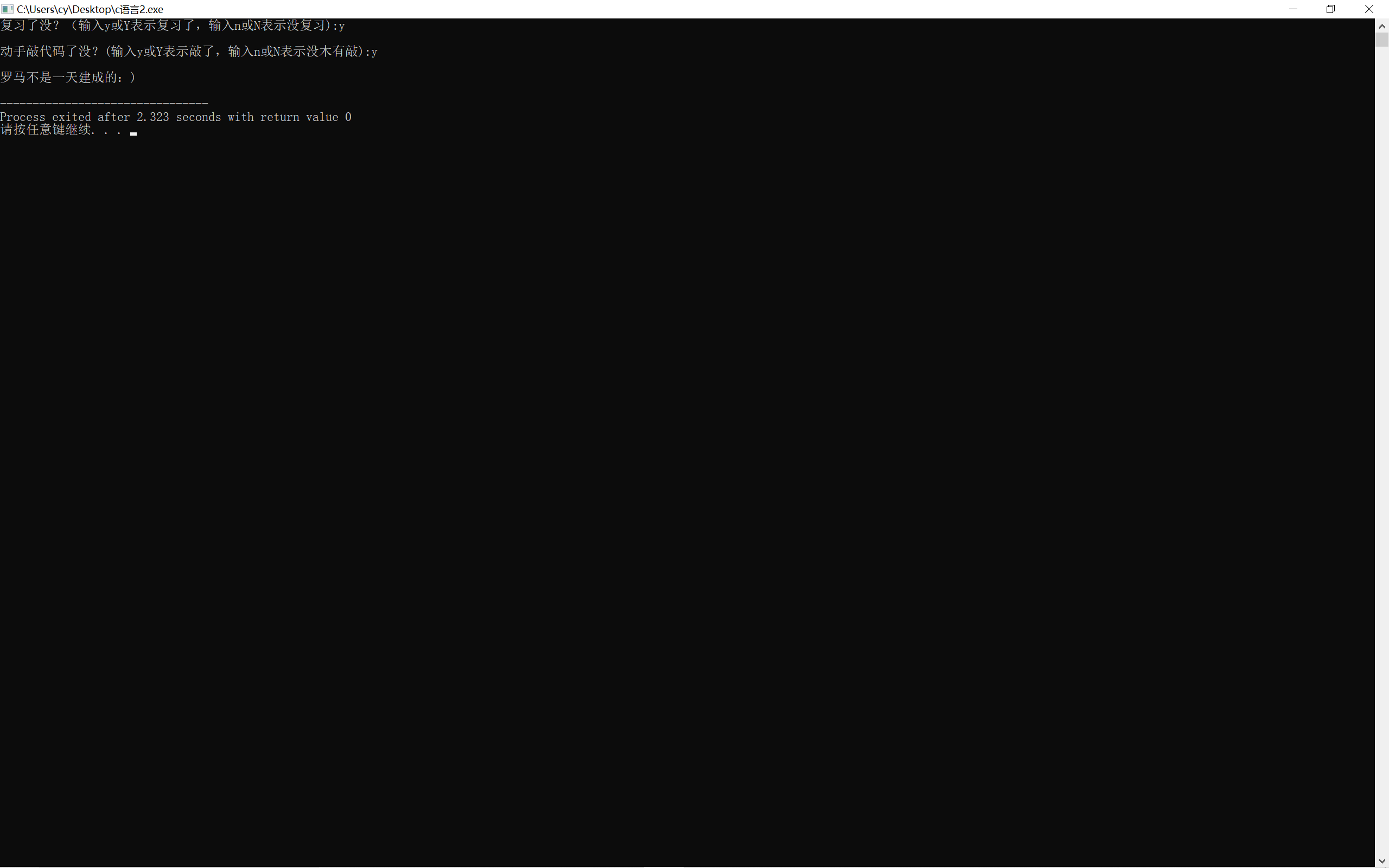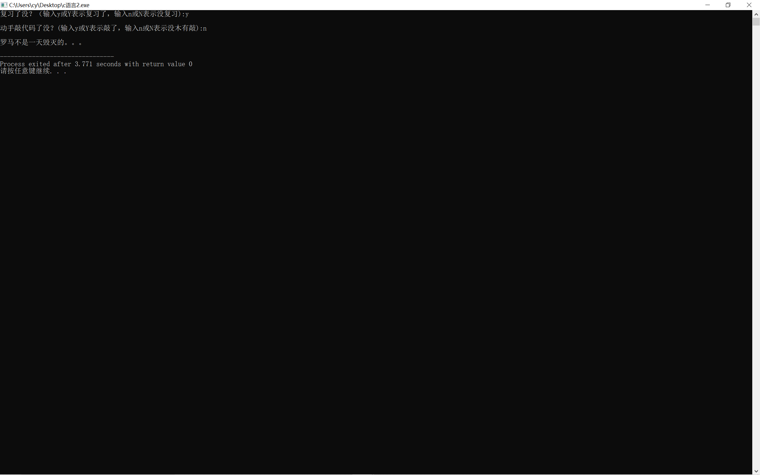 #include<stdio.h> int main() { char ans1, ans2; printf("复习了没?(输入y或Y表示复习了,输入n或N表示没复习):"); ans1= getchar(); getchar(); printf("\n动手敲代码了没?(输入y或Y表示敲了,输入n或N表示没木有敲):") ; ans2= getchar(); getchar(); if((ans1==89||ans1==121)&&(ans2==89||ans2==121) ) printf("\n罗马不是一天建成的:)\n"); else printf("\n罗马不是一天毁灭的。。。\n"); return 0; }