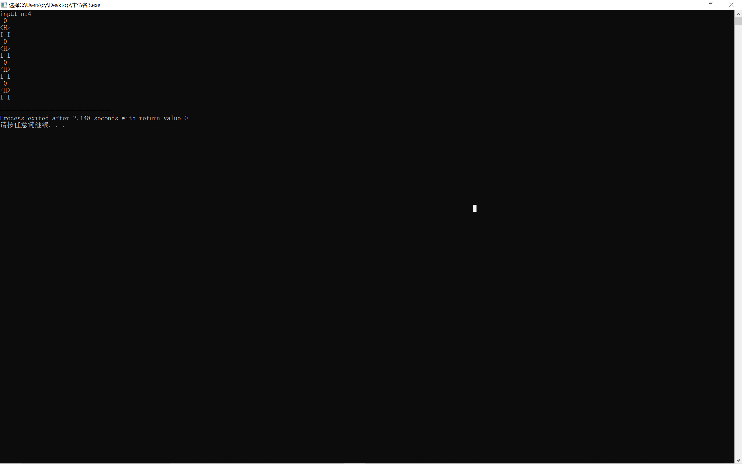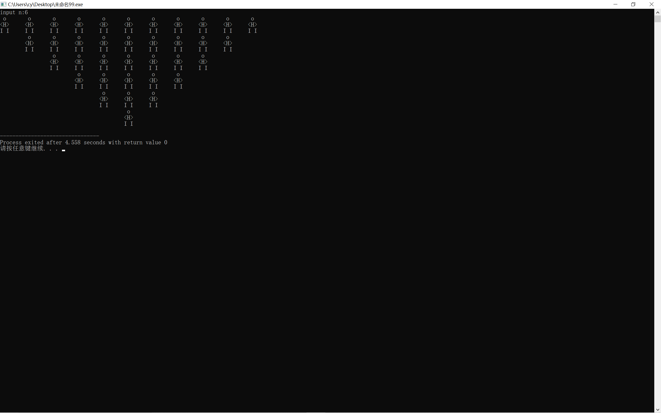 #include<stdio.h> int main() { int n,j; printf("input n:"); scanf("%d",&n); for(j=1;j<=n;j++) { printf(" 0\n"); printf("<H>\n"); printf("I I\n"); } return 0; }