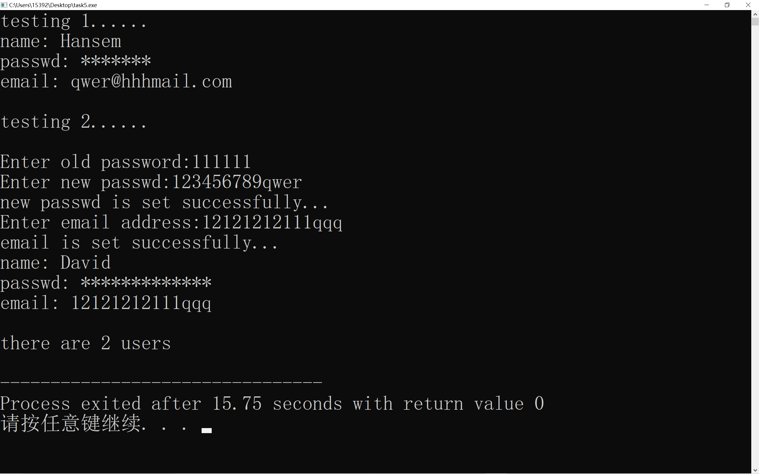 #pragma once #include<iostream> #include<cstring> #include<string> using namespace std; class user { public: user(string name0,string passwd0="111111",string email0=""); void set_email(); void change_passwd(); void print_info() const; void static print_n() {cout << "there are " << n << " users" << endl;} private: string name; string passwd; string email; static int n; }; user::user(string name0,string passwd0,string email0):name(name0),passwd(passwd0),email(email0){n++;} int user::n=0; void user::set_email(){ cout << "Enter email address:"; cin >> email; cout << "email is set successfully..." << endl; } void user::change_passwd(){ string oldpasswd = passwd; int count; cout << "Enter old password:"; cin >> passwd; count = 1; while(oldpasswd!=passwd&&count<3){ cout << "password input error. please re-enter again:"; cin >> passwd; count++; if(oldpasswd!=passwd&&count == 3){ cout << "password input error. please try after a while." << endl; } } if(oldpasswd == passwd){ cout << "Enter new passwd:"; cin >> passwd; cout << "new passwd is set successfully..." << endl; } if(oldpasswd!=passwd&&count == 3) passwd = oldpasswd; } void user::print_info() const{ int k; cout << "name: " << name << endl; cout << "passwd: "; k = passwd.size(); while(k--) cout << "*"; cout << endl; cout << "email: " << email << endl; }