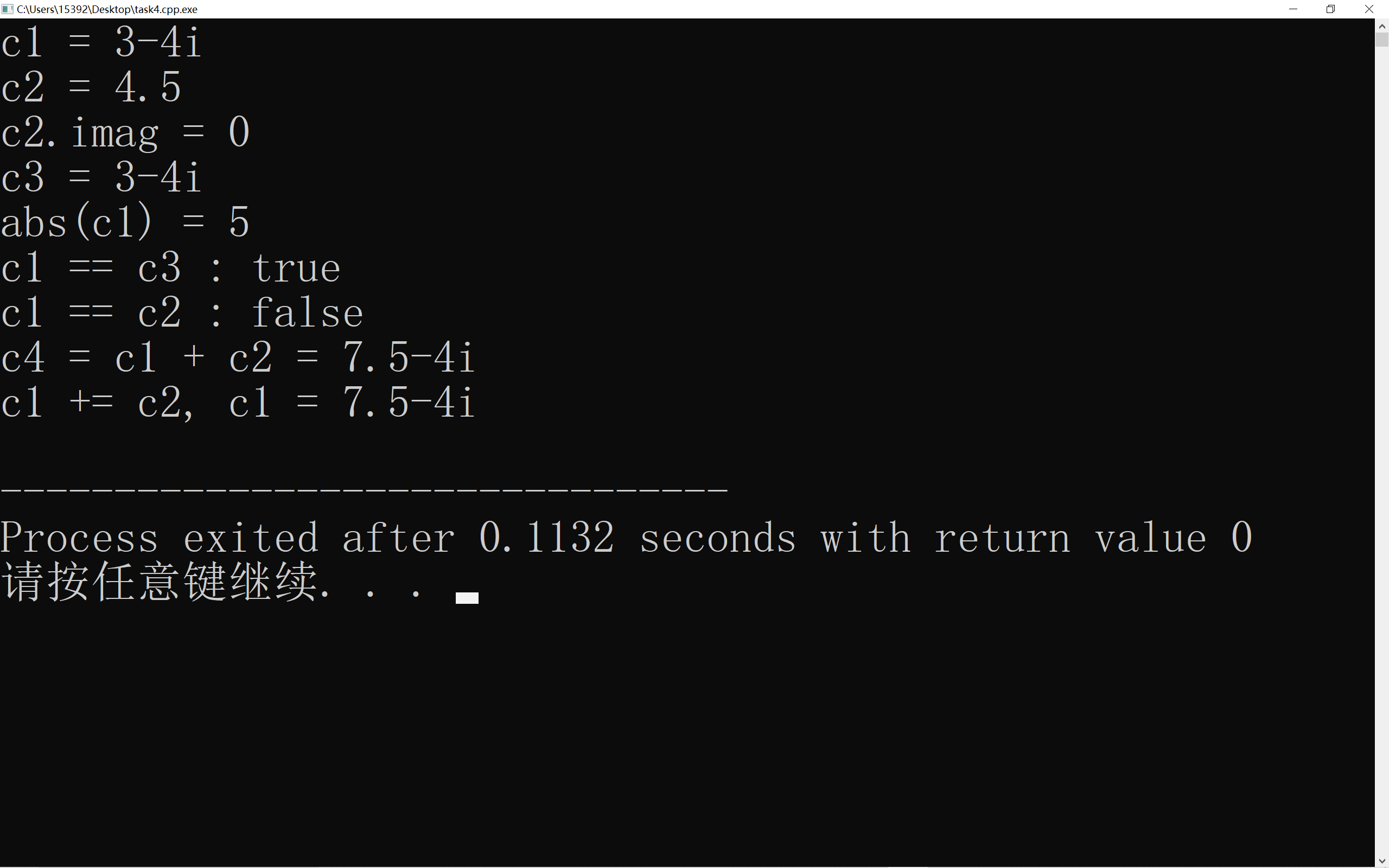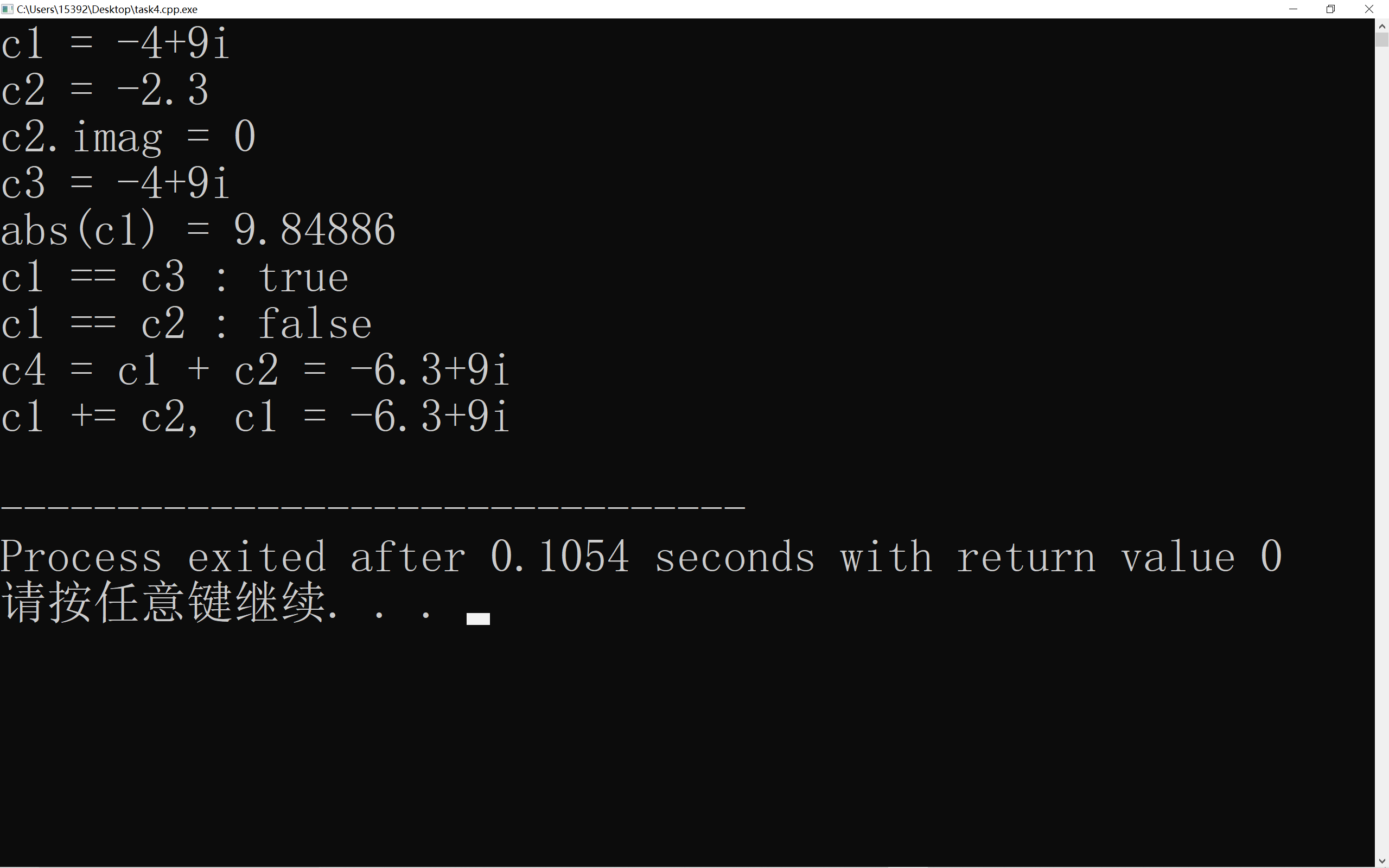 #pragma once #include<iostream> #include<cmath> using std::cout; using std::endl; class complex{ public: complex(double r=0.0,double i=0.0):real(r),imag(i){} complex(complex& c) :real(c.real), imag(c.imag){}void add(const complex &c){ real+=c.real; imag+=c.imag;} void show()const; double get_real() const { return real; } double get_imag() const { return imag; } friend double abs(const complex &c); friend complex add(const complex &c1,const complex &c2); friend bool is_equal(const complex &c1,const complex &c2); private: double real,imag; }; void complex::show()const{ if(imag!=0) cout << real << "+" << imag << "i" << endl; else cout << real << imag << "i" << endl; } double abs(const complex &c){ double m; m=sqrt(c.real*c.real+c.imag*c.imag); return m; } complex add(const complex &c1,const complex &c2){ complex c3; c3.real=c1.real+c2.real; c3.imag=c1.imag+c2.imag; return c3; } bool is_equal(const complex &c1,const complex &c2){ if(c1.real==c2.real&&c1.imag==c2.imag) return true; else return false; }
