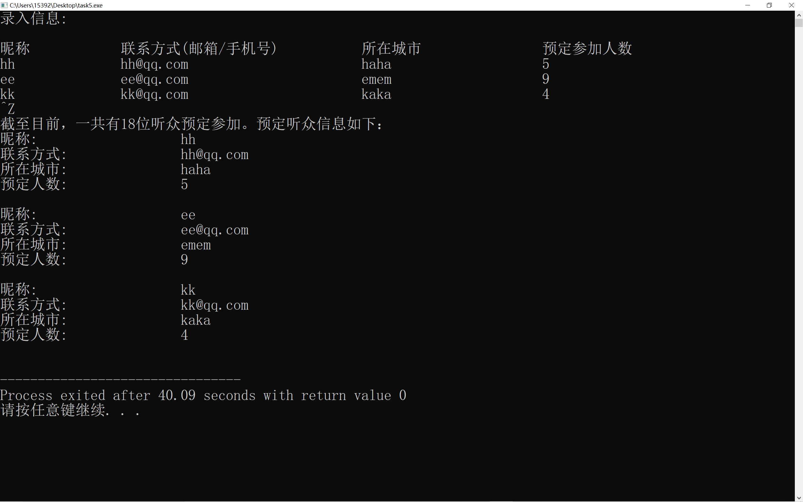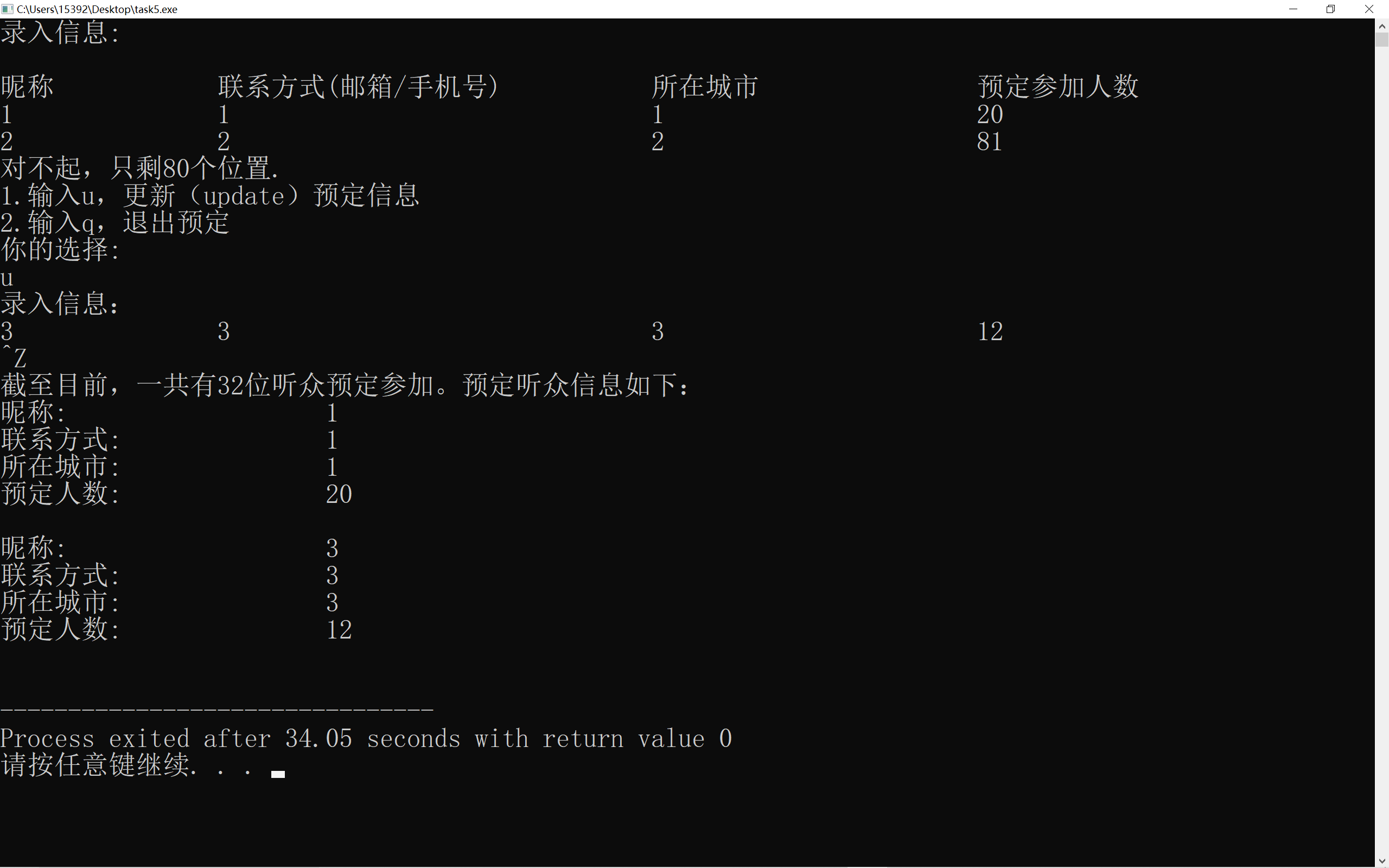 #include <iostream> #include<vector> #include"info.hpp" #include<iomanip> using namespace std; int main() { const int capacity = 100; string name,cont,city; int n,sum; int count = 0; vector<info> audience_info_list; cout << "录入信息: " << endl; cout << endl; cout << "昵称\t\t" << "联系方式(邮箱/手机号)\t\t" << "所在城市\t\t" << "预定参加人数 " << endl; while(cin >> name){ cin >> cont >> city >> n; count = count + n; sum = capacity - count; if(sum > 0||sum == 0){ info io = info(name,cont,city,n); audience_info_list.push_back(io); } else{ string wise; count = count -n; sum = capacity - count; cout << "对不起,只剩" << sum << "个位置." << endl; cout << "1.输入u,更新(update)预定信息" << endl; cout << "2.输入q,退出预定" << endl; cout << "你的选择:"; cout << endl; cin >> wise; if(wise == "q") break; else if(wise == "u"){ cout << "录入信息:" << endl; continue; } } if (sum == capacity) break; } cout << "截至目前,一共有" << count << "位听众预定参加。预定听众信息如下:" << endl; for(int i = 0;i < audience_info_list.size();i++) audience_info_list.at(i).print(); }