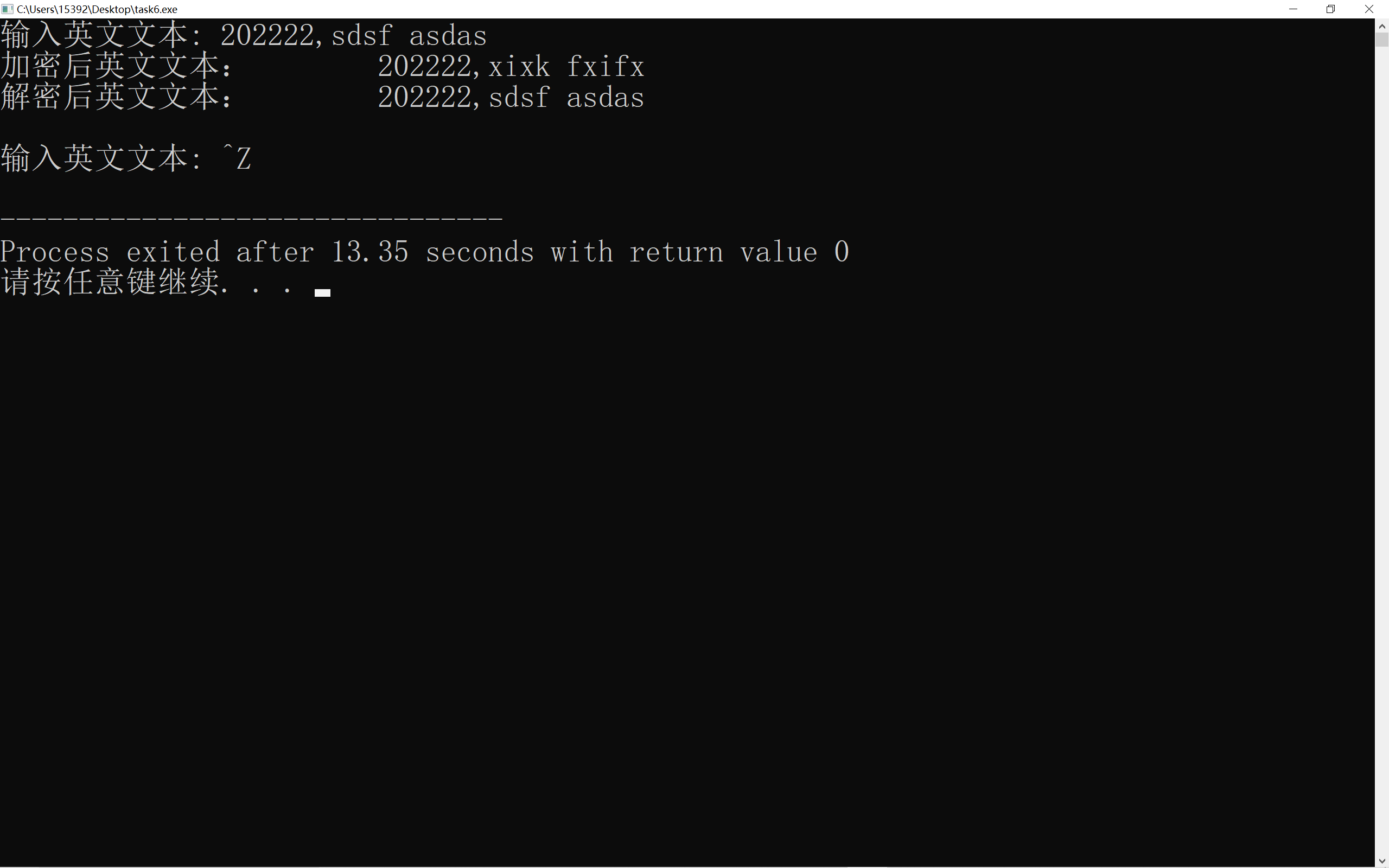 #include "textcoder.hpp" #include <iostream> #include <string> void test() { using namespace std; string text, encoded_text, decoded_text; cout << "输入英文文本: "; while (getline(cin, text)) { encoded_text = TextCoder(text).get_ciphertext(); cout << "加密后英文文本:\t" << encoded_text << endl; decoded_text = TextCoder(encoded_text).get_deciphertext(); cout << "解密后英文文本:\t" << decoded_text << endl; cout << "\n输入英文文本: "; } } int main() { test(); }