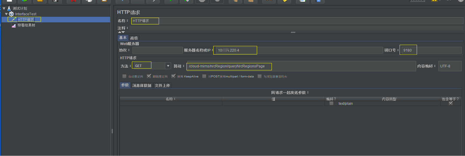 http请求页面需要配置的项(见下图):以这个接口为例http://106.14.xxx.x:9180/cloud-mims/nrcRegion/queryNrcRegionsPage