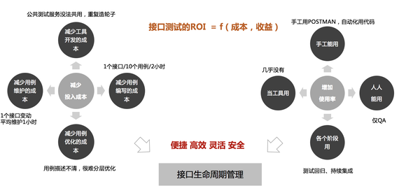 以上的问题都会导致在接口测试与管理上效率低下,也就是我们常说的ROI低下,一个直观的分析图示如下