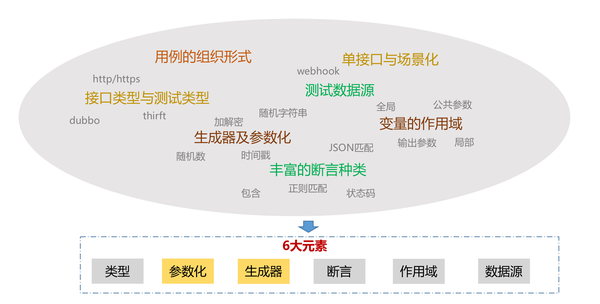 如何真正的减少“用例编写、优化、维护”的成本,应该要分析接口测试用例编写应该具备哪些部分,从中提取出可以优化的元素进行细致的分析和对症下药。如下所示在接口测试编写过程中所列举的6大要素: