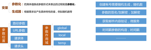 首先要明确的是参数化和生成器的定义,参数化:即把具体值换成参数形式来表达的过程就是参数化。生成器:根据需求去产生具体特性的值。可以预知在构建一个接口测试场景的时候,一个接口入参,它可能是固定值,亦或是变量,而变量的生成,需要根据需求按照场景去特定的去生成,比如创建帐号需要随机生成,那么就需要随机数;参数的签名和加解密;时间戳参数的构造;等等;另外一个层面,参数是具备位置属性和作用域属性的。位置属性中可能在路径、URL、请求体或者请求头。而作用域属性可能是对所有接口测试场景全局有效的公共参数,也可能是在一个场景中生效的,甚至于只是临时产生的。如此看来,要解决参数化及生成器的问题,要结合上述所分析的特点。