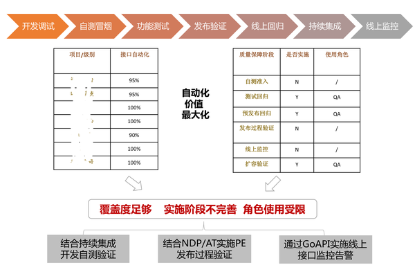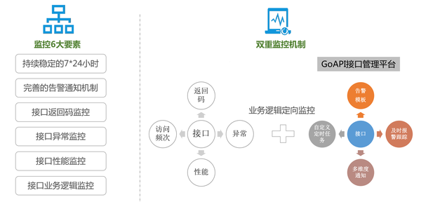 一般的发布平台都应该具备以下步骤:offline、deploy、check、online;先将当前实例下线,接着部署,然后check服务可用性,最后online到线上提供服务。只是当前check这一步只是健康检查,而非服务功能性验证。那么如此可以基于check扩展去调用GoAPI openAPI实施自动化执行,通过后再自动online。 通过这个方案实施后,PE每次发布再也不会“提心吊胆”,因为每一个应用实例都是经过严格功能回归后上线的。 以上从软件研发周期,针对开发自测、发布过给出了解决方案,但最重要的环节是线上接口监控。通过监控是否能够及时发现接口不可用,减少对用户的使用及体验是非常重要的,接下来就聊下在做线上接口监控所面临的问题及解决方案