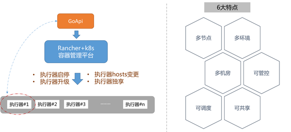 第二阶段的实施,在完成接口测试平台化之后,同样的思路解决问题,也就是在GoAPI中引入执行器的概念,而每一个执行器都是一个容器,容器内部会启动一个服务与GoAPI平台联动。无论你是哪个环境,可以动态在执行接口测试任务的过程中修改对应的hosts,保证环境的无缝切换,彻底解决了执行环境受限的问题。整个容器管理采用的是rancher+K8s,如下图所示