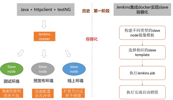 分析历史对于采用java+TestNG+ Jenkins的典型接口测试框架,在执行环境层面面临的问题有如下3点:节点资源利用率不高、资源配置存在冲突、扩展节点迁移不便捷。如此第一阶段实施,在当时采用的是“容器化”的思路:Jenkins集成docker实现slave容器化,根据不同环境构建不同类型的slave node镜像模版,每次执行自动拉起对应容器,执行完整自动销毁。