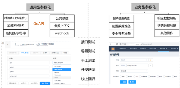 针对参数化及生成器的解决,是作用于不同的接口测试场景及接口测试阶段。参数化的实施分为两大类:通用型参数化和业务型参数化。通用型参数化实施是围绕着GoAPI接口全生命周期测试平台去完成的,业务型参数化是自研测试数据服务平台