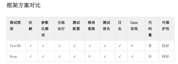 说起框架特点当时还很“自豪”的讲出了几大特点: 特点: Annotation 依赖性测试 支持并发测试 支持错误重运行测试 参数化测试 支持测试分组 通过testng.xml来管理测试 详实的报告,可按照自己需要进行二次开发定 同时在当时也调研过python的方案,Python Nose 方案 ,两者对比如下: