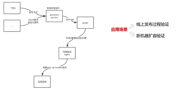 结合发布平台实施PE发布过程验证 某个业务线上应用集群上百台机器,而线上回归执行运行一次不能完整覆盖到每台机器上应用实例的可用性,可能会造成某台应用实例因为不可知因素带着问题上线,导致线上故障。那么对于PE而言,他们的诉求是希望每次发布的每一台应用实例都是经过自动化回归过的,基于此,结合内部发布平台实施方案如下