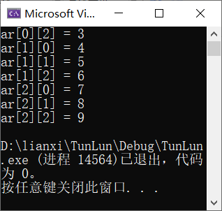 int main() { const int row = 3; const int col = 3; int ar[row][col] = {}; int k = 1; for (int i = 0; i < row; i++) { for (int j = 0; j < col; j++) { ar[i][j] = k++; } } for (int i = 0; i < row; i++) { for (int j = 0; j < col; j++) { printf("ar[%d][%d] = %d \n", i, j, ar[i][j]); } } return 0; }