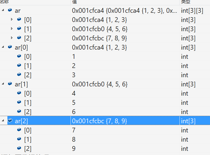 由下图可以看出 ar[0],ar[1],ar[2]分别为一个包含三个整型元素的一维数组: