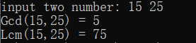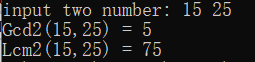 int Gcd(int a, int b) { if (a == 0 || b == 0)//判断输入的值是否符合要求. return -1; while (a % b != 0)// { int tmp = a % b; a = b; b = tmp; } return b; } int Lcm(int a, int b) { assert(a * b != 0); int tmp = 0; return tmp = a * b / Gcd(a, b); } int main() { int a = 0, b = 0; printf("input two number: ");//输入两个数 scanf_s("%d %d", &a, &b); int gcd = Gcd(a, b); int lcm = Lcm(a, b); printf("Gcd(%d,%d) = %d\nLcm(%d,%d) = %d", a, b, gcd, a, b, lcm); return 0; }