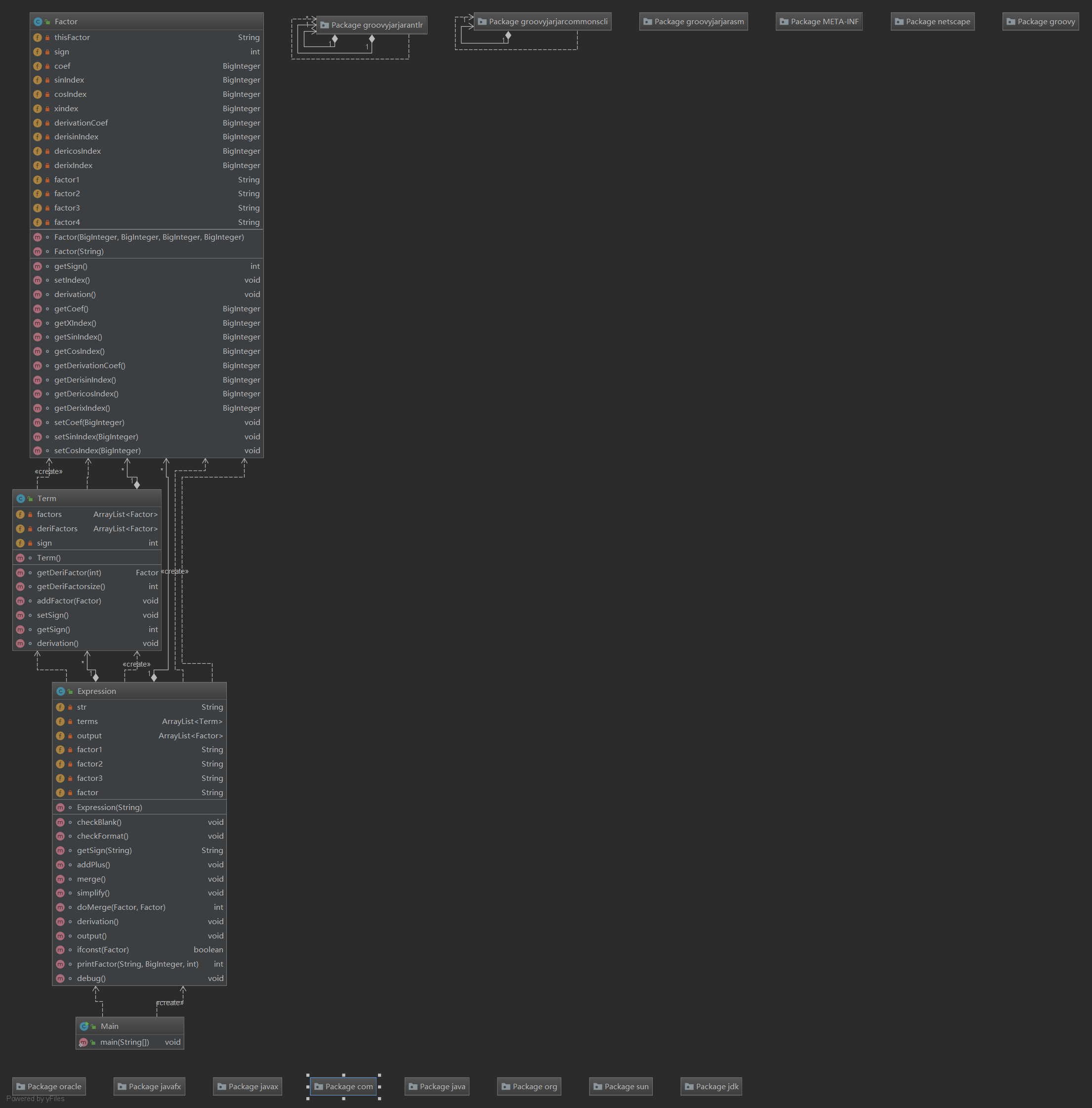第一次作业中具有两个类,主类负责读取输入的字符串并传递给poly类,而poly类中具有对输入数据合法性的检查,二元组的数据存储,对二元组的求导操作,以及合并同类项的化简操作。这些操作又是由一些基本的操作如提取数字,提取符号等基本操作构成。