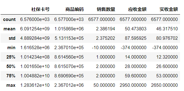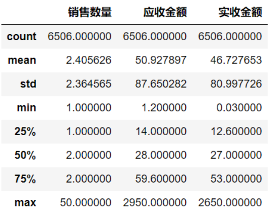 通过描述统计信息可以看到,“销售数量”、“应收金额”、“实收金额”这三列数据的最小值出现了负数,这明显不符合常理,数据中存在异常值的干扰,因此要对数据进一步处理,以排除异常值的影响: