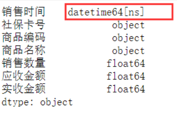 1 def splitSaletime(timeColSer): 2 timeList=[] 3 for value in timeColSer: 4 dateStr=value.split(' ')[0] #用空格进行分割 5 timeList.append(dateStr) 6 timeSer=pd.Series(timeList) #将列表转行为一维数据Series类型 7 return timeSer 8 #获取“销售时间”这一列 9 timeSer = data.loc[:,'销售时间'] 10 #对字符串进行分割,提取销售日期 11 dateSer = splitSaletime(timeSer) 12 #修改销售时间这一列的值 13 data.loc[:,'销售时间'] = dateSer 14 data.head() 15 data.loc[:,'销售时间']=pd.to_datetime(data.loc[:,'销售时间'],format='%Y-%m-%d', errors='coerce') 16 print(data.dtypes)